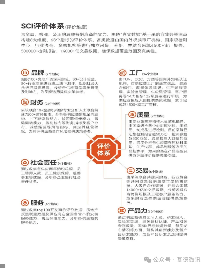 一、SCI兩大目的:創(chuàng)建建材行業(yè)供應商白名單,精準快速鎖定素顏賣方SCI是Supplier Composite Index的簡稱,即供應商綜合指數,指通過對供應商進行全方位的評審,分析企業(yè)在經濟活動中的表現,反映企業(yè)的綜合能力及在行業(yè)、社會中的相對貢獻和地位。采筑聯合100+開發(fā)商、80+設計機構、15+金融機構、11家國內外權威認證機構、30家國家級檢測中心、11家行業(yè)協會等成立SCI共建聯盟,以專業(yè)的視角、嚴謹的評審體系、龐大的數據基礎,圍繞“真實.數據”,基于采購方業(yè)務關注點,提取工廠、質量、交易、產品力、服務、社會責任、財務、品牌共8大維度68個細分指標對供應商進行全面評價,使用一手數據客觀公正輸出“SCI”,為行業(yè)及用戶提供更加真實、專業(yè)的數據服務,賦能產業(yè)鏈高質量發(fā)展。面向采購商,SCI測評結果將輔助采購商客戶準確、快速決策,解決供應商尋源難、尋源成本高、評價難等痛點問題。面向供應商,SCI測評結果協助供應商清晰定位,精準觸達商機,并完成交易。