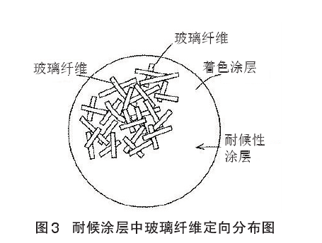 該高耐候性彩色水泥瓦制作流程是將以水泥為主要成分的坯料擠壓成坯,瓦體養(yǎng)護(hù)硬化,涂以涂料,修平整,形成底層涂膜層。為了防止瓦中堿分對(duì)上層涂膜層的侵蝕,可在底涂膜層上,涂以耐堿性涂料,形成耐堿涂膜層,然后涂以著色涂料,形成裝飾涂膜層,最后涂以耐候涂料,形成耐候涂膜層(見圖1和圖2)。著色涂層由含有所需著色顏料的水性丙烯酸涂料構(gòu)成,其厚度約為100μm。耐候性涂層由與著色層相同的水性丙烯酸涂料與耐候性纖維(添加量為7%~12%)組成的涂料構(gòu)成,其厚度約為 25μm。耐候性涂料用噴槍高壓噴涂在瓦著色裝飾涂層上。耐候性涂料涂覆在著色涂層上時(shí),玻璃纖維以平躺姿態(tài),水平方向無(wú)序隨機(jī)定向分布(見圖 3)。對(duì)瓦涂以耐候性涂料后,為了固定玻璃纖維,約在100℃下充分干燥。
